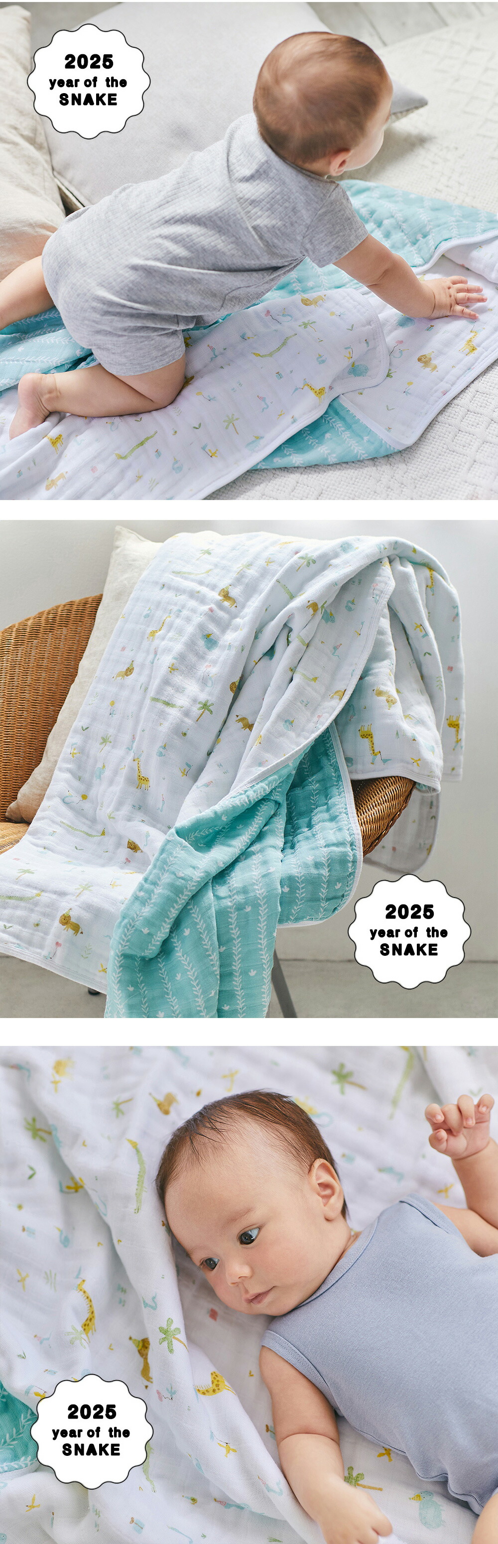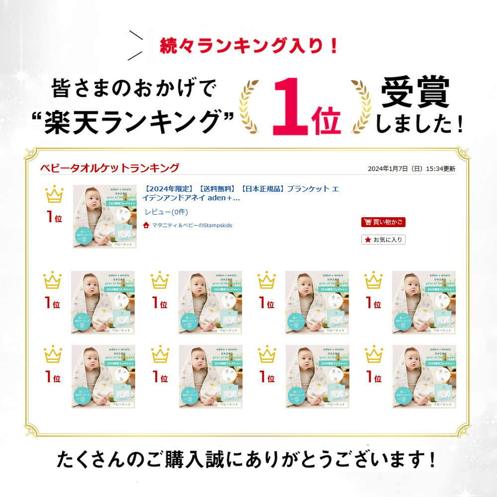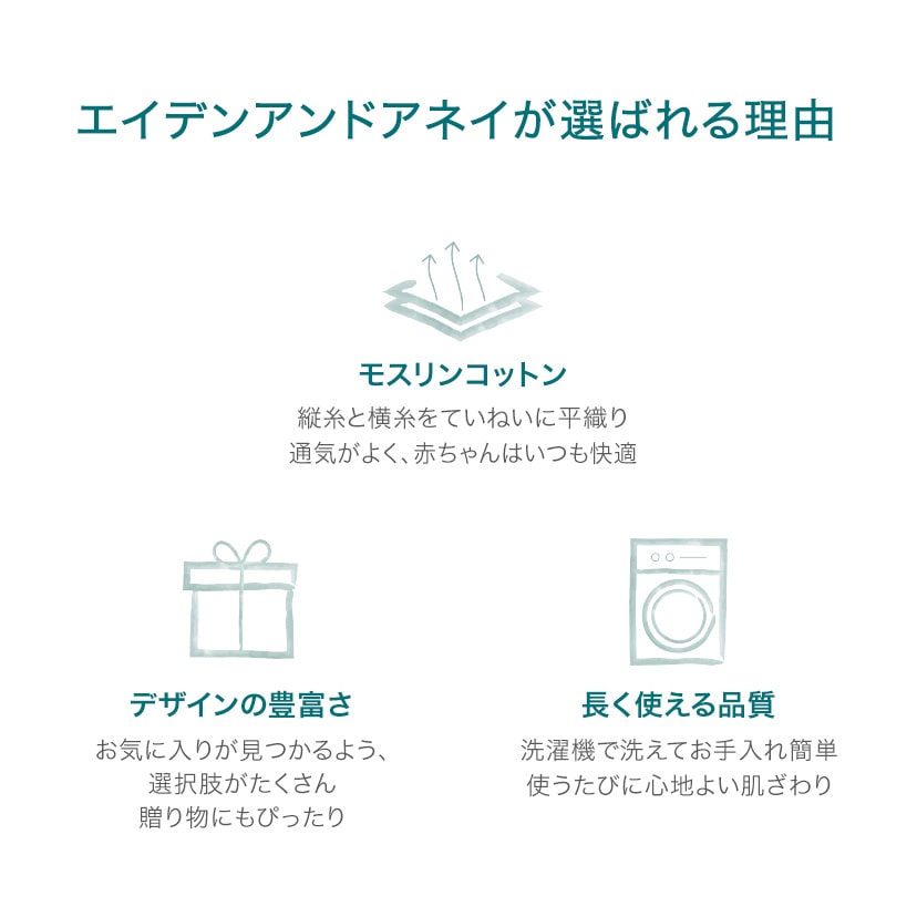| ITEM : aden+anais(エイデンアンドアネイ)モスリンコットン ドリームブランケット 干支限定コレクション 1枚 1P 高品質&スタイリッシュなデザインが人気のニューヨーク生まれのブランド、aden+anais(エイデンアンドアネイ)。 2019年の発売以来毎年大人気の干支柄コレクションです。 その年の干支をモチーフにした愛らしいデザインは、お誕生の記念やご出産のお祝いに最適! <Year of the horse イヤーオブザホース> 2026年はうま年。さわやかなカラーのお馬さんたちが描かれた幻想的なデザイン。 お馬さんのようにたくましく健康にやさしい子になりますように! フレッシュなミント系のカラーを基調としているので、男女どちらの赤ちゃんにも似合います。 <Year of the snake イヤーオブザスネーク> 2025年は巳年。愛らしいヘビさんとお友達の動物が描かれたハッピーな世界です。 ヘビさんのように沢山のお友達に恵まれますように! ニュートラルなカラーを基調としているので、男女どちらの赤ちゃんにも似合います。 【ドリームブランケット】4枚重ねのモスリンコットン100%のドリーム・ブランケットは、大きめサイズで厚みもたっぷり。お肌に優しい肌ざわりです。 ブランケット以外にプレイマットやひざ掛けとしてもご使用でき、赤ちゃんとの触れ合いに最適です。大判なのでベビーからキッズまで末永くご使用いただけます。 高品質のコットンモスリンコットン使用で洗えば洗うほどふんわりやわらかに♪ デリケートな赤ちゃんやお子さんにも安心してお使いいただけます♪ 就寝時やちょっとしたくつろぎの時にもぴったりな大きめサイズ。 ご自宅の洗濯機で洗えるイージーケアで、洗えば洗うほどに柔らさが増していきます。 厚地ですが、通気が良いので赤ちゃんはいつでも快適に。くつろぎの時間を心地良いものにしてくれます。 ブランケットとして以外にも、アイディア次第でたくさんの使い方があります。 + プレイマットとして + お昼寝用のマットとして + オムツ替えシートとして + 大人も肌掛けやひざ掛けとしてお使いいただけます マルチに使えるのでお子様が大きくなっても、家族みんなで使えてとっても便利! 本国アメリカで権威ある賞を数々受賞しています。 ハリウッドセレブにも愛用者続出! 高級感のあるスタイリッシュな専用BOX入りで出産祝いやプレゼント、ギフトにピッタリです! 【スタンプキッズは、エイデンアンドアネイの正規販売店です。全て日本正規代理店商品(正規品)ですので、安心してお買い求めください。】 |