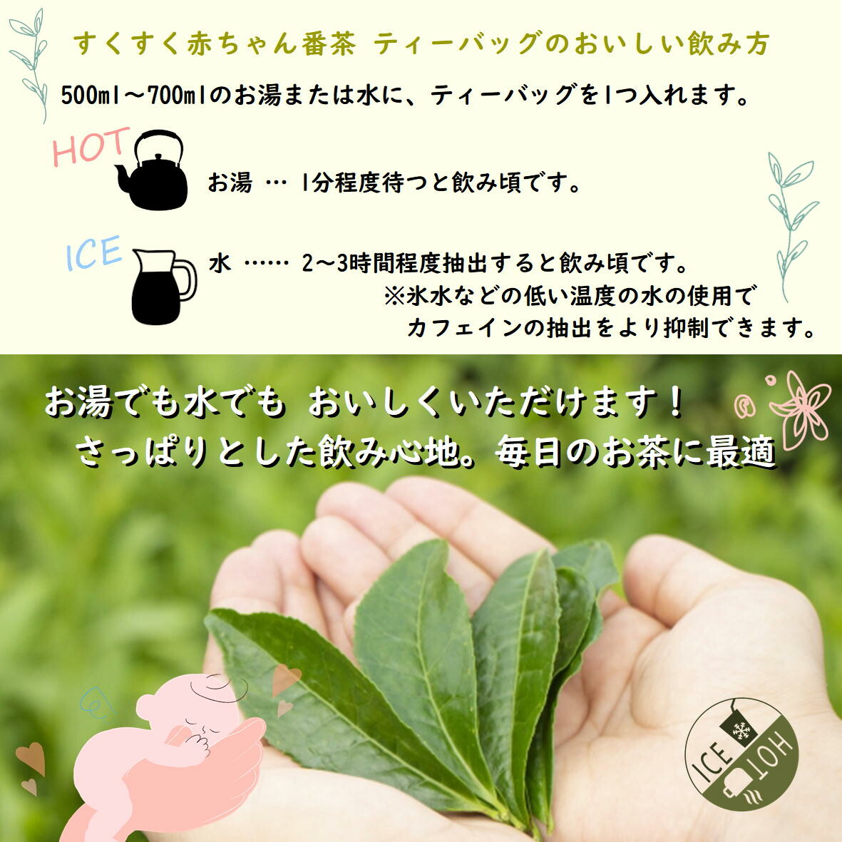 | 低カフェイン従来品比80%減(成分検査済み) 温かいお茶、水出しのお茶、両方お楽しみいただけます。 【ティーバッグのおいしい入れ方】 500ml〜700mlのお湯または水に、ティーバッグを1つ入れます。 お湯…1分程度待つと飲み頃です。 水……2〜3時間程度抽出すると飲み頃です。 ※氷水などの低い温度の水の使用で、カフェインの抽出をより抑制できます。 ※小さいお子様に与える場合は、水の割合を増やすなど 濃さを調節してください。 |