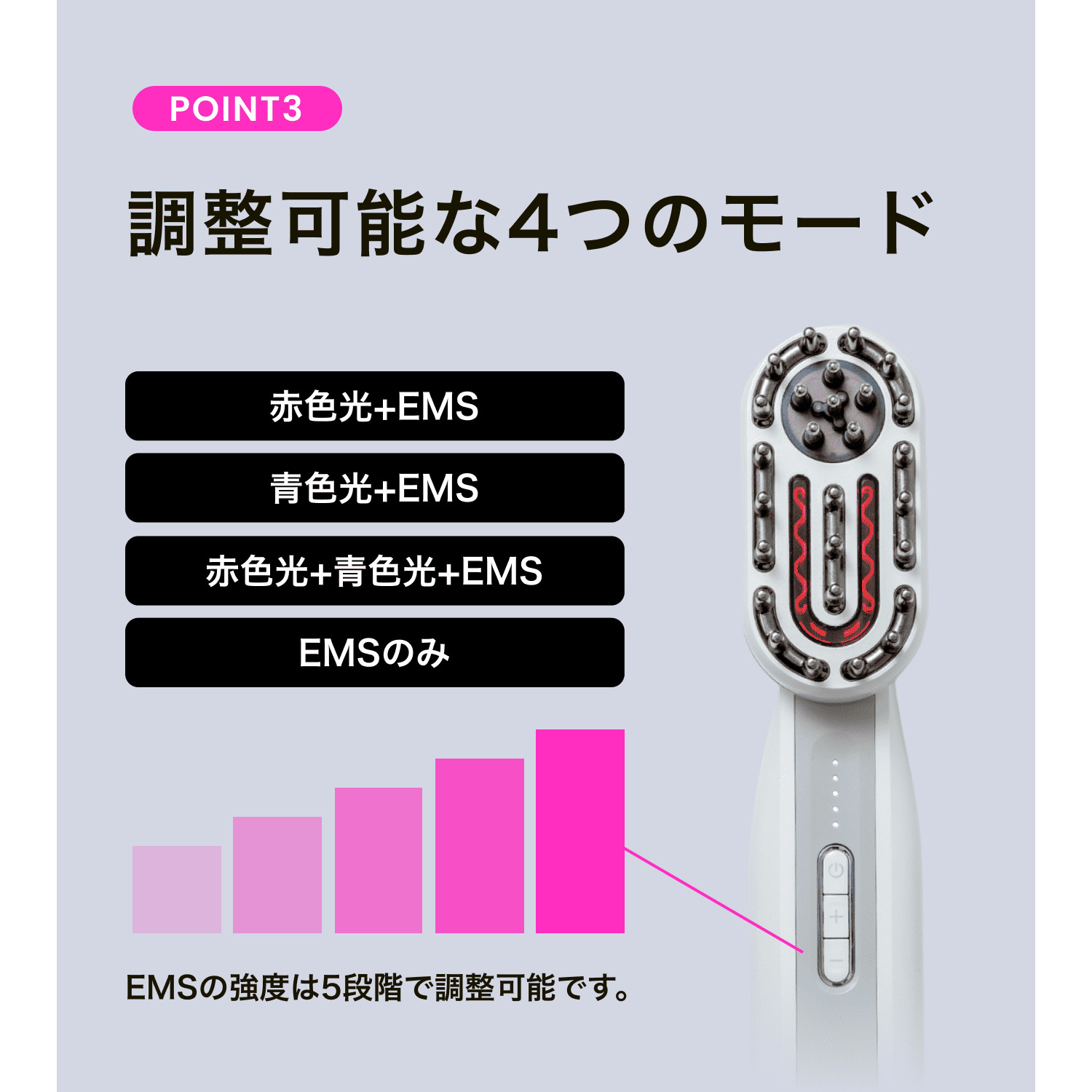 【4つのLEDモード】 EMS+赤色LED+青色LEDを組み合わせた4つのモードで、頭皮からボディまでトータルケア。ニーズに合わせて自由に選べます◎<br>