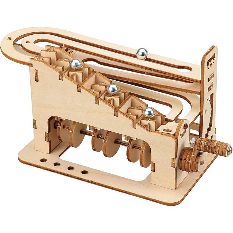 ハンドルをまわすと鉄球がエスカレーターを昇ってコースターを転がる!