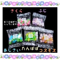 ■あじさい、さくら、たんぽぽ、ふじ、コスモスと花の名前が付けられた5種類の金平糖のアソートです。