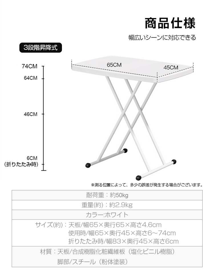 テーブル 折りたたみ サイドテーブル 高さ3段調節 幅65cm センターテーブル おしゃれ 昇降テーブル 在宅勤務 昇降式 リビングテーブル コンパクト 収納