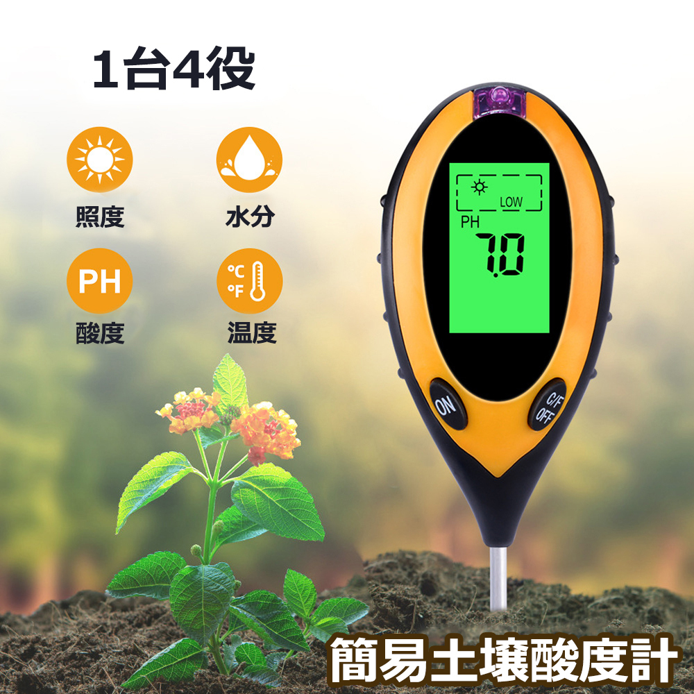 簡易土壌酸度計 水分 温度 照度計付き 1台4役 ペーハー PH計 ペーハー測定器 土壌酸度測定 土壌水分測定 照度測定 送料無料