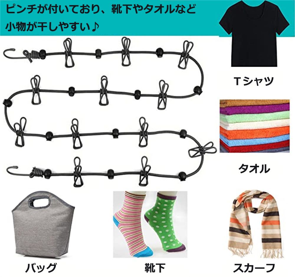 物干しロープ 物干し用ロープ ピンチがついて便利! 洗濯ピンチ付きロープ 300cm 便利 部屋干し 軽い 簡易設置 使い勝手 簡単収納 送料無料