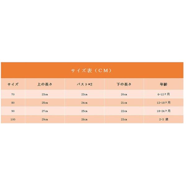 サイズ:6-12ヶ月(80)、12-18ヶ月(90)、18-24ヶ月(100)、2−3歳(110)、3−4歳(120)向けです。