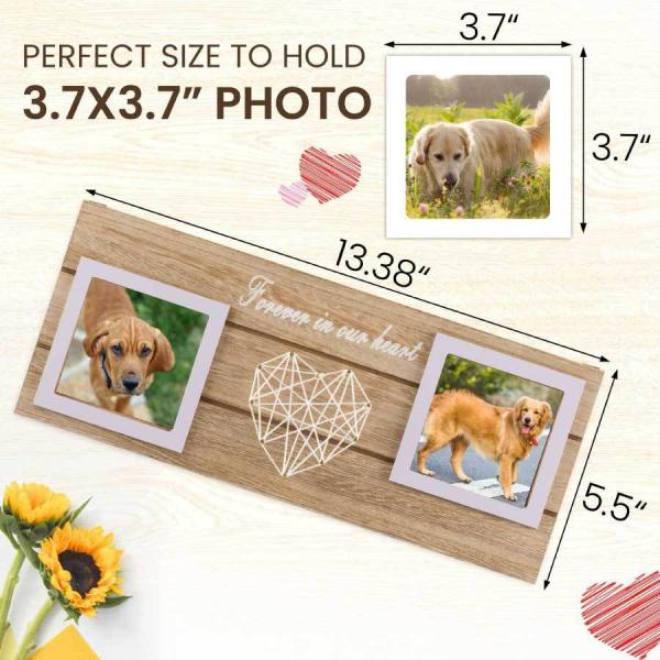 2つの写真フレーム:記念写真用のフレームには、お気に入りの思い出を保存するための2つの写真フレームがあります。フレームは木でできており、2つの3.7 x3.7インチの写真フレームがあります。足跡は上質な木とハート型のデザインラインでできており、美しいペットのフレームと「いつも私たちの心の中に」というフレーズがあります
