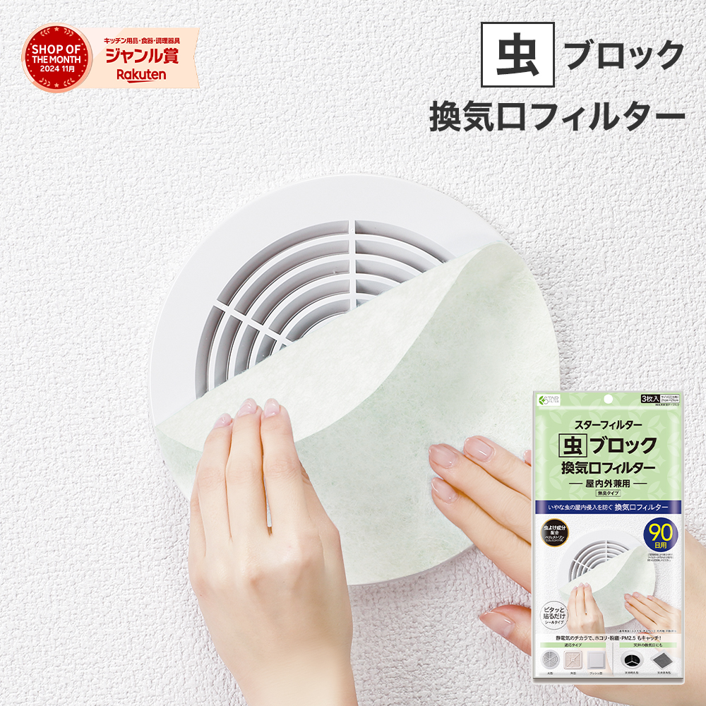 スターフィルター 虫 ブロック 換気口 フィルター 21×21cm 3枚入 虫よけ成分配合 通気口 給気口 ホコリ ダニ 防虫 屋内用 シールタイプ ネコポス配送可