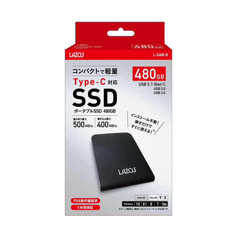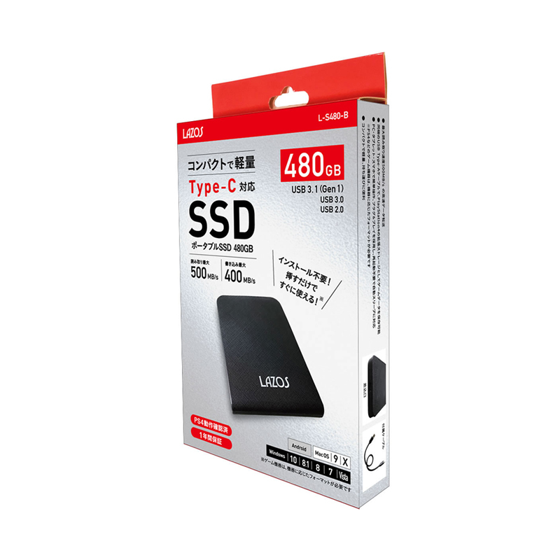コンパクトで軽量!480GB Type-C対応のポータブルSSDです。 ● 最大読み取り速度500MB/s の高速データ転送 ● Type-Cポートを搭載したMacBookなどのPCに直接接続可能(Type-Cケーブルは別売) ● 同梱のUSB Type-Aケーブルで、PlayStation4の拡張ストレージとしてゲームデータを保存可能 ● PC・タブレット・スマホで簡単操作、プラグ&プレイを採用し、再起動不要で自動スリープに対応 ※PS4などのゲーム機器は、機器に応じたフォーマットが必要です ● コンパクトで軽量、持ち運びに便利 |