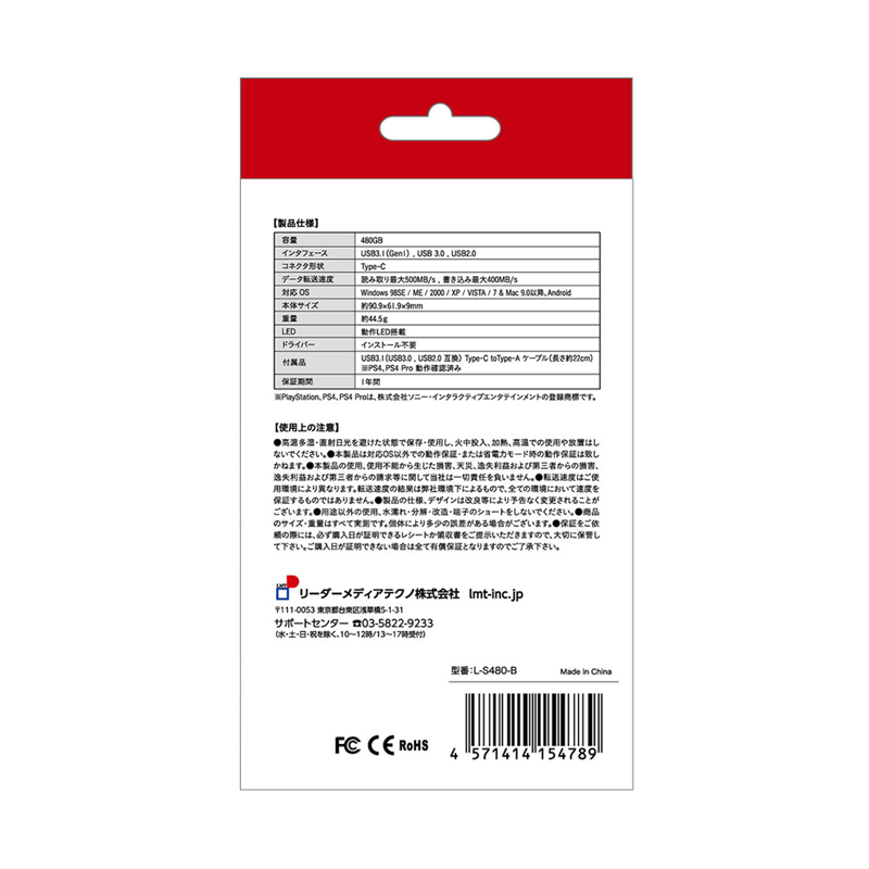 容量:480GB インタフェース:USB3.1(Gen1) , USB 3.0 , USB2.0 コネクタ形状:Type-C データ転送速度:読み取り最大500MB/s , 書き込み最大400MB/s 対応OS:Windows 98SE / ME / 2000 / XP / VISTA / 7 & Mac 9.0以降、Android 本体サイズ:約90.9×61.9×9mm 重量:約44.5g LED:動作LED搭載 ドライバー:インストール不要 保証期間:1年間 付属品:USB3.1(USB3.0 , USB2.0 互換) Type-C toType-A ケーブル(長さ約22cm) ※PS4、PS4 Pro 動作確認済み |