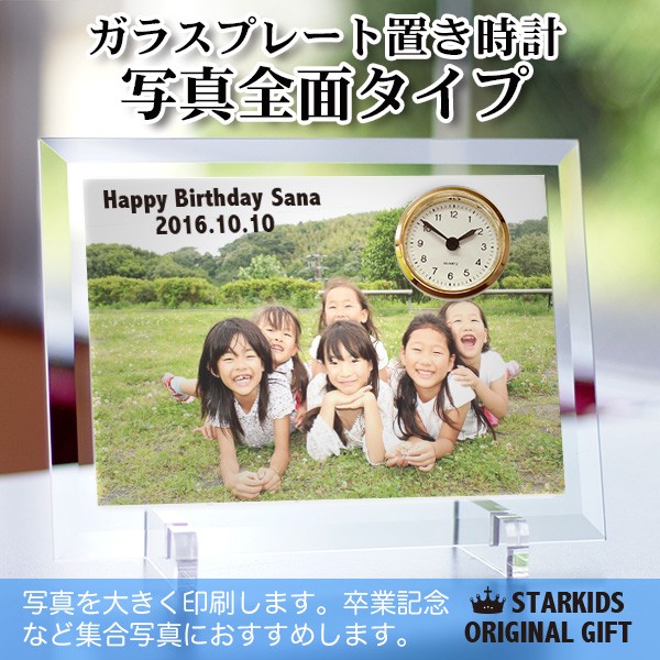 商品の特徴 | ガラス製のプレートに小さな金枠の時計を取り付けました。印刷面は綺麗な発色の色あせしないUV印刷です。1個からオーダーが可能です。御祝い記念品、出産内祝い、婚礼内祝いなどにお使い頂けます。 |