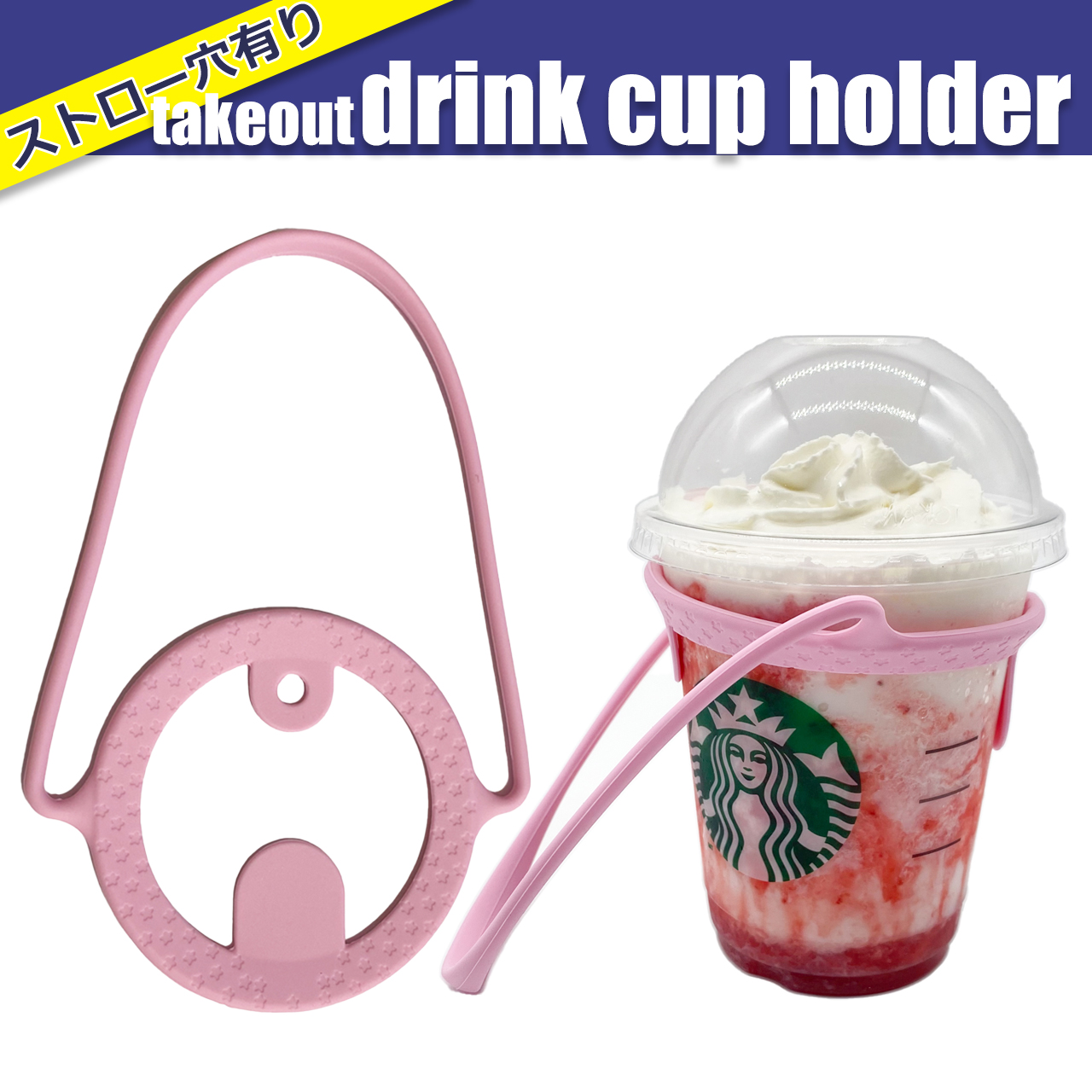 ドリンクカップホルダー ドリンクホルダー コンビニコーヒー スタバコーヒー ストローホルダー付き 持ち運び 桃 ピンク