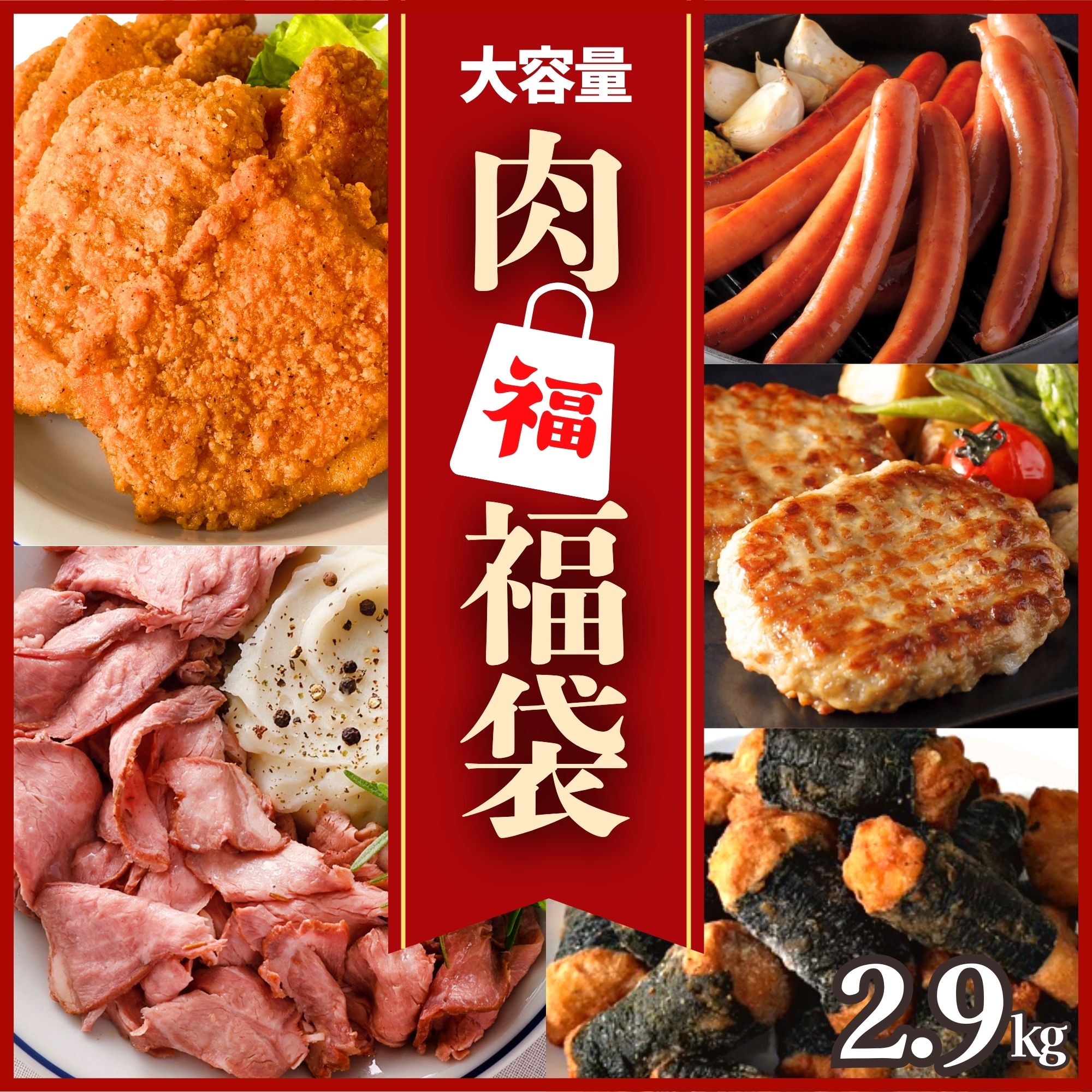 肉 福袋 食品 5種 2.9kg冷凍食品 アウトレット 業務用 ローストビーフ ハンバーグ フライドチキン ウインナー チキン 唐揚げ お惣菜 おかず おやつ おつまみ お肉 冷凍 簡単調理 送料無料 ピクニック お花見 新生活