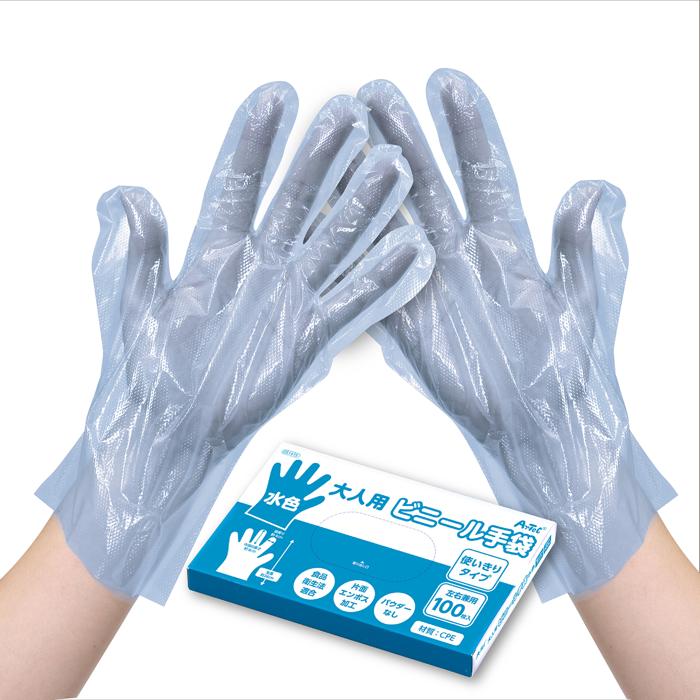 大人用 ビニール手袋 水色 100枚/箱入 51415 パウダーフリー エンボス加工 タッチパネル対応 衛生 使い捨て 滑り止め 清掃 作業 介護 工作 大容量 家庭 業務