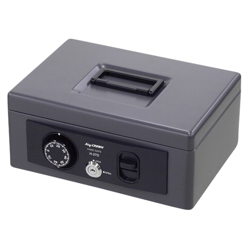 日本アイエスケイ手提金庫 H−27DH-27D●外寸:幅272×奥212×高118mm●内寸(通帳・紙幣収納スペース):幅242×奥163×高54mm●重量:2.5kg●解除方法:ダイヤル錠,シリンダー錠●材質:スチール●A5サイズ収納可能●鍵2個,コイントレー付