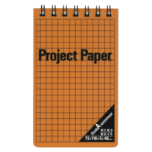 耐水メモ エマージェンシー オレンジ ●罫種類:5mm方眼●サイズ:縦118×横73mm●中紙枚数:40枚●材質:表紙=PP,中紙=ユポ紙(合成紙)
