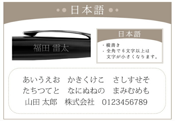 | ※文字間隔やレイアウトは当店の判断で微調整させていただくことがあります。 ・性と名の間はドットやピリオドの区切りがなければ半角スペースを入れます。 ・人名以外や当店で判断できかねる場合はご入稿通りで名入れいたします。 ・名入れ内容のご確認のメールやお電話をさせていただく事があります。 後々のトラブル防止の為、全部大文字等、大文字小文字は入稿通りで名入れをご希望の場合は、入稿文字と一緒に【大文字で】【入稿通りで】等、気になる点は必ず別途ご指示ください。 左利きのお客様もご指示いただければ対応いたします。 また、文字化けする可能性のあるお名前はあらかじめメッセージ欄に一言入れていただけると幸いです。 複数ご注文くださる場合は、ご希望商品をそれぞれ買い物かごに入れて書体等を選択し、名前をご入力ください。 そして決済してしまわずに、また戻って次の商品を選択し、名入れのご指示を繰り返していただければ一度にご注文いただけます。 又は、ご希望商品と名入れ内容だけを選択し買い物かごに入れて頂いた後、備考欄にまとめて名前をご記入いただいても問題ございません。 ※カラーなどが異なる場合は必ず下記参考例のようにご記入ください。 ・ブラック 筆記体 Y.hanako ・オレンジ 日本語(ゴシック体) 山田 太郎 ※当店で受注確認後、すぐに作業にとりかかりますので、ご注文後の名入れ内容の変更は間に合わない場合がございます。よく確認の上ご注文お願いいたします。 |