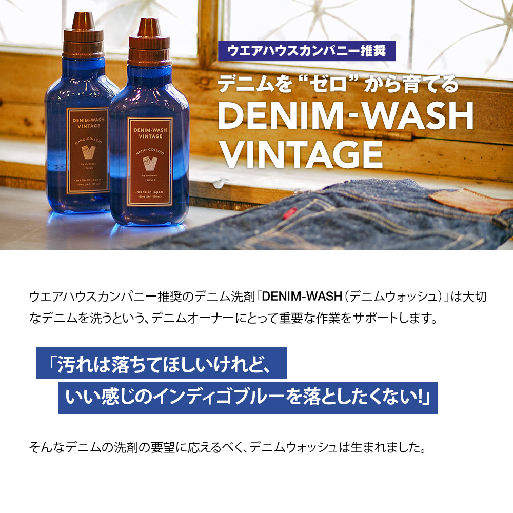 | 当店は ウェアハウス WAREHOUSE & CO. の正規販売店です。 ウエアハウスカンパニー推奨。デニムをゼロから育てるデニム用洗剤「Lot 5221 DENIM-WASH VINTAGE」 デニムウォッシュ ヴィンテージは、穿き込んだジーンズなどの皮脂汚れや不純物のみを取り除き、濃いインディゴを保ってくれる効果のあるデニム用洗剤です。 浸け置き洗いならさらにその効果は大きく、色落ちさせたくない一本やヴィンテージジーンズにも使えます。 ゴールドラベルはフローラル、シルバーラベルはこれまで通りのシトラスの香りです。 多くのデニム好きに手にしていただきたいアイテムです。 <デニムウォッシュ ヴィンテージとは> 愛着のあるデニムを大切に洗いあげる洗剤です。 デニムウォッシュ ヴィンテージは環境にも身体にも「優しく、ストレスフリー、スタイリッシュ」 相反する三つの共存を可能にしたいという思いから始まりました。 <洗浄の仕組み> 「汚れを剥がして分解する」という驚きの洗浄力。 原料は食品として使用されている大豆脂肪酸と水(精製水) それらをナノ粒子という細かなレベルで活性化させて、汚れだけに付着し、衣料からその汚れを分解させるという、全く新しい洗浄剤です。 オーガニックな素材をナノレベルの粒子で活性化。本来地球上に在ったものをハイテクノロジーでその使用価値を高めるという、画期的な試みなのです。 <自然に優しい> 洗浄後の排水は、成分がオーガニックであるため鹸化(油脂を分解)されるとともに99%自然に存在するバクテリアに分解されるので、「海洋警察庁」から「海に流しても良い製品」という国際認定を受けています。 また、抗菌作用もあり、食中毒菌、各種ウィルスなどの不活性化に効果的です。 <デニムに適している理由> デニムが醸し出すタテ糸とヨコ糸、またインディゴ染料の相互関係を考慮して石油系界面活性剤・蛍光剤・漂白剤を使用していないので、必要以上の色落ちがありません。 またヴィンテージ衣料の様な経年変化で繊細になった繊維を洗浄する際にも、負担のかからない方法で前述の「汚れの剥離」だけを行えます。 従来の水、湯洗いでは菌などが残るために臭いが気になりますが、菌を抑制し自然なシトラス/フローラルの香りで大切な衣料を包みます。 <ご使用方法> 10リットルの水に対しキャップ1杯(10ml)の溶液をご使用下さい。キャップ1杯の目安はキャップの内側にある線になります。 汚れの目立つ部分には直接溶液をなじませてご使用ください。 一晩の漬け置き洗いを推奨致しますが、洗濯の際にはデニムを裏返しにし手洗いコースを選択下さい。摩擦が気になる場合はデニムをネットに入れて下さい。(脱水は洗濯機を使用されることをお勧めします) |
