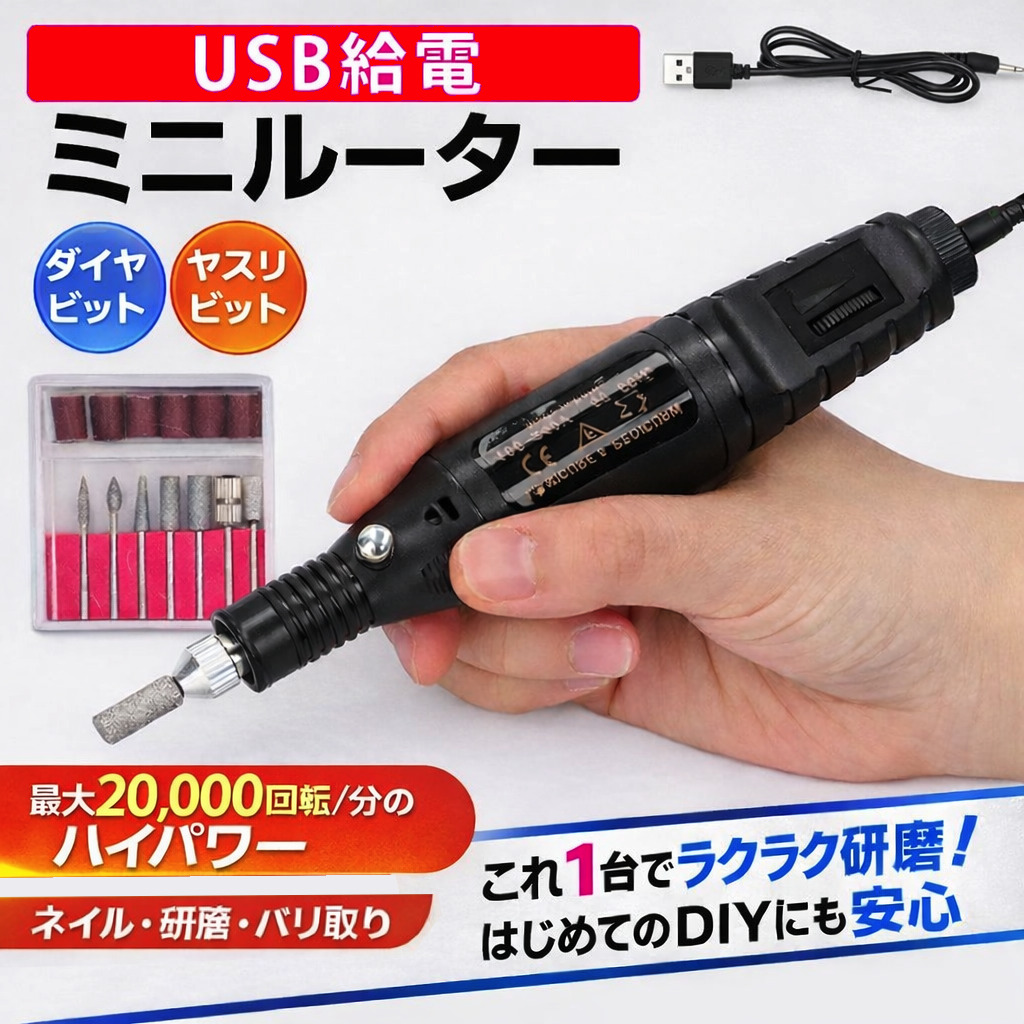 ルーター リューター 電動 ミニルーター ビット ヤスリ 工具 USB 研磨 小型 彫刻 砥石 ネイル 有線