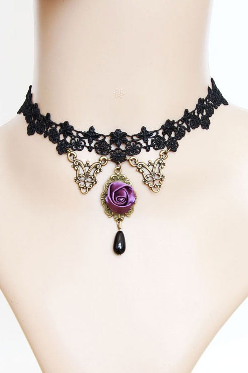 即納 メール便送料無料 代引不可 アンティーク風 バイオレット クイーン ローズ ブラックレース チョーカー アクセ