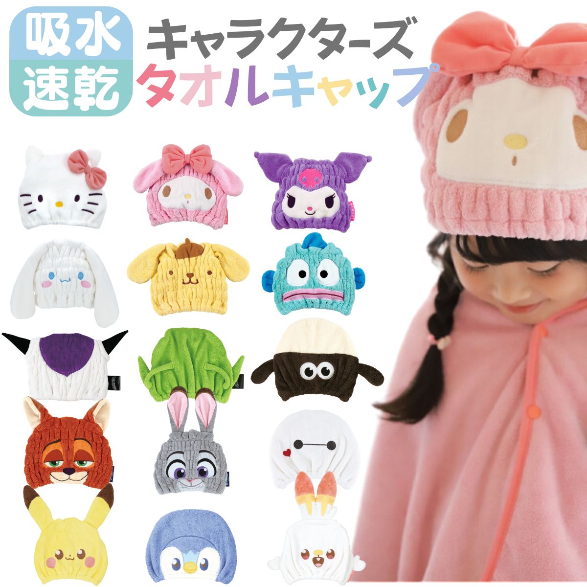 吸水 速乾 ヘアキャップ サンリオ ディズニー ポケモン タオルキャップ タオル スイミング プール キャップ 子供 男の子 女の子 マイクロファイバー かわいい