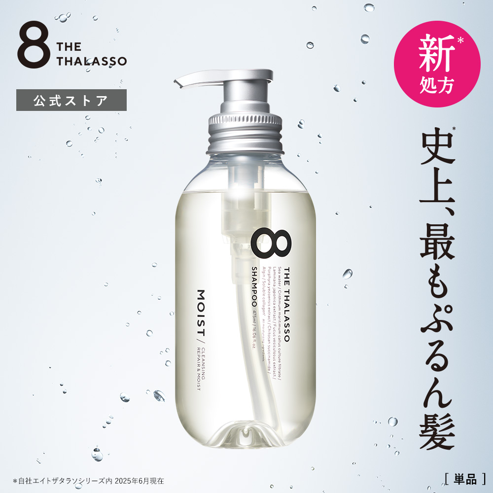 *1 エイトザタラソモイストシャンプーN:クリスマスリチウムカルムス培養液、リンゴ果実培養細胞エキス、ブドウ果実細胞エキス/エイトザタラソモイストトリートメントN:クリスマムマリチマムカルス培養液、リンゴ果実培養細胞エキス、アルガニアスピノサカルス培養エキス *2 エイトザタラソ モイストシャンプーN:クリスマムマリチマムカルス培養液、水溶性コラーゲン、海水、スサビノリエキス、アルギン酸Na、ヒバマタエキス、キトサンサクシナミド、マコンブエキス/エイトザタラソ モイストトリートメントN:クリスマムマリチマムカルス培養液、水溶性コラーゲン、海水、スサビノリエキス、アルギニンNa、ヒバマタエキス、スクワラン、キトサン *3 旧製品と比較して、エイトザタラソ モイストシャンプー N:ポリクオタニウム−51(保湿)/エイトザタラソ モイストトリートメント N:γ−ドコサラクトン(保湿)を新たに配合 *4 自社エイトザタラソシリーズ内2025年6月現在*5 シリーズ比 *6 保湿成分(水を含む) *7 ココイル加水分解コラーゲンK、ココイル加水分解ケラチンK(羊毛) *8 髪内部のダメージのこと