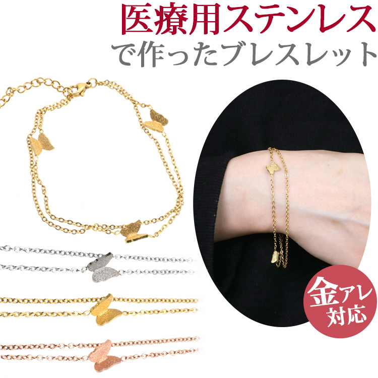 ブレスレット ステンレス レディース 金属アレルギー対応 20代 30代 40代 50代 サ―ジカル シルバー ダブルチェーンバタフライブレスレット
