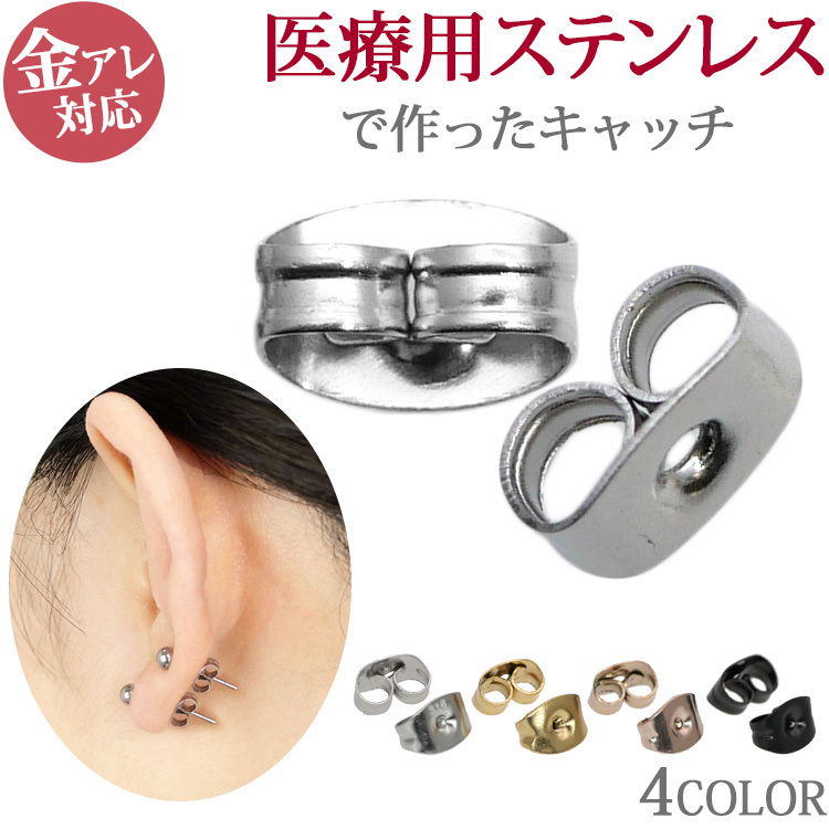 着用時や着脱の際に、紛失してしまう事も多いピアスキャッチ。スペアがあると安心ですよね。医療用にも使用されるサージカルステンレス製ですので、金属アレルギーの方も安心してご利用いただけます。
