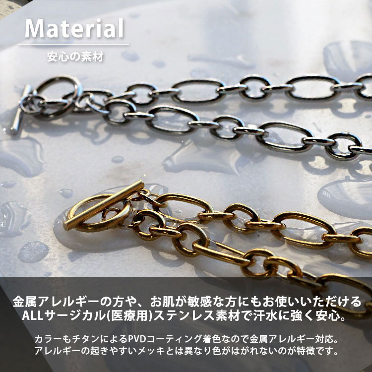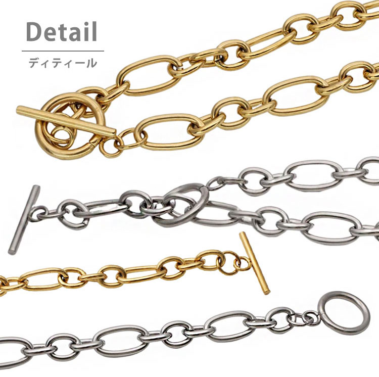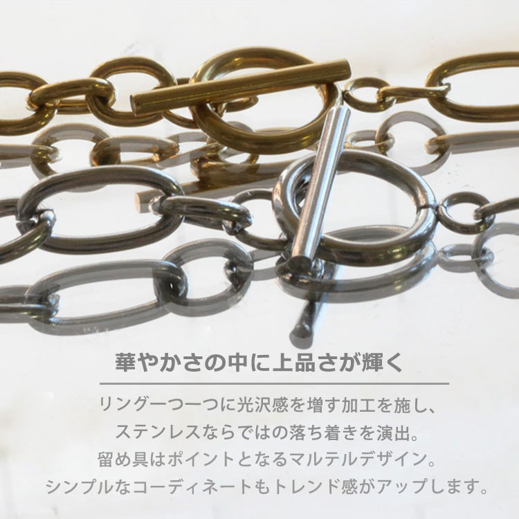 リング一つ一つに光沢感が増す加工を施し、ステンレスならではの落ち着きを演出。シンプルなコーディネートもトレンド感がアップします。