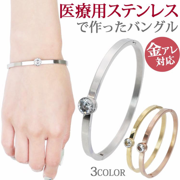 金属アレルギー対応 ステンレスブレスレット 一粒ジュエルのワンタッチバングル キュービックジルコニア 316L サージカルステンレス