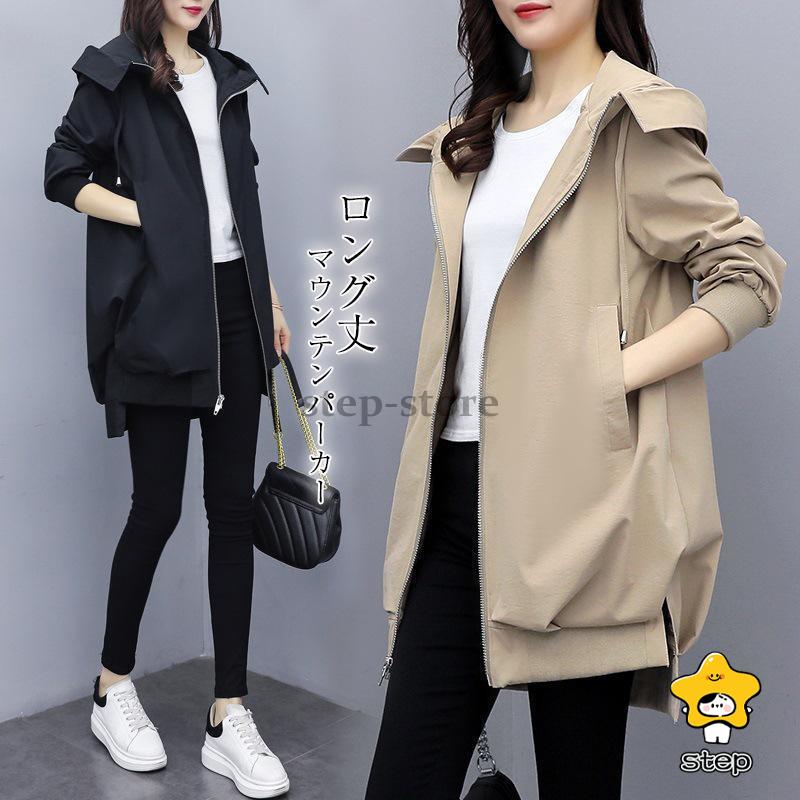 マウンテンパーカー レディース トレンチコート ミディアム丈 ウィンドブレーカー ファスナー 裹地無し フード付き ジャケット 羽織 アウター 春秋 ゆったり