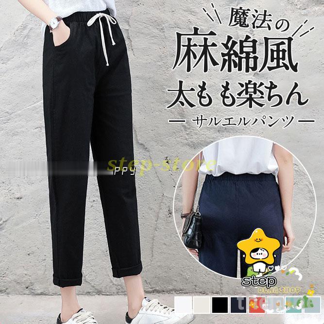 サルエルパンツ パンツ ボトムス お出かけ 麻綿風 チノパン 春夏 ウエストゴム カジュアル ぽっちゃり ゆったり 体型カバー フェミニン