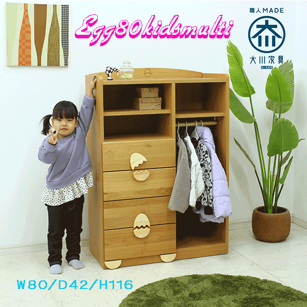 《完成品・送料無料・マルチタンス》表面材/アルダー材、製造/日本製【幅800/奥行420/高さ1161】自然塗装で仕上げた日本製の安心・安全な多機能型マルチタンスです。卵の取っ手が愉快でお茶目、ハンガーパイプはお子様の成長に合わせての可動式、引き出しは全て落下防止ストッパー付き。