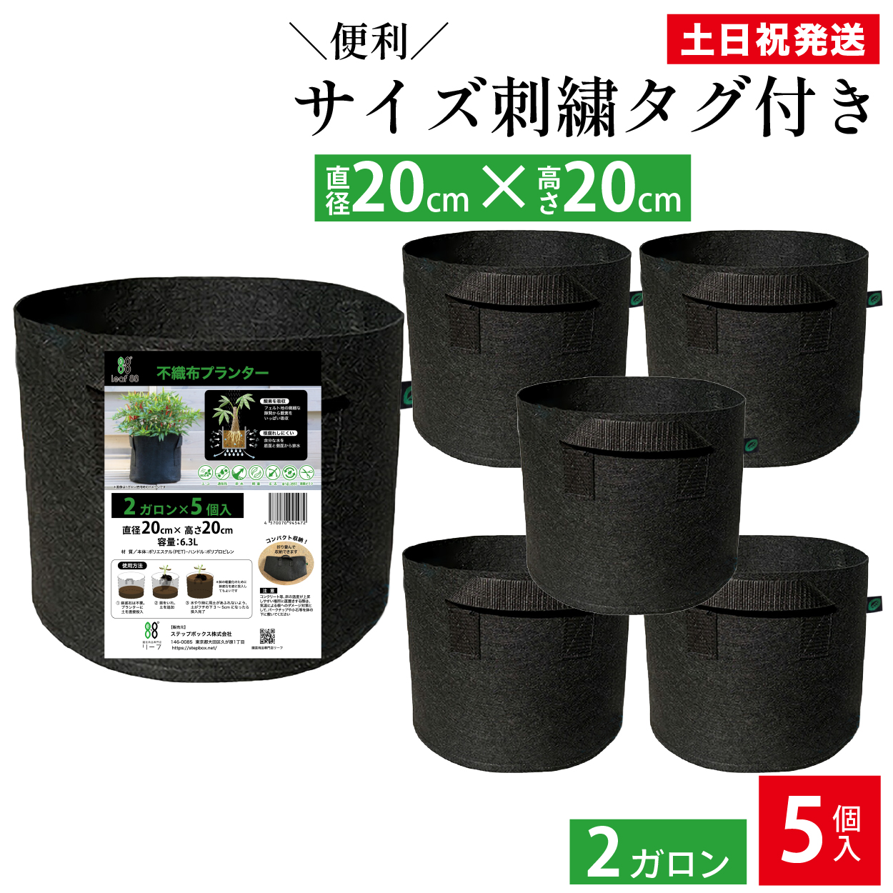 不織布プランター 2ガロン 5個 不織布プランター 6.5号鉢 20x20 植木鉢 大型 軽量 深鉢 フェルト 布鉢 家庭菜園 ベランダ菜園 ハーブ 黒