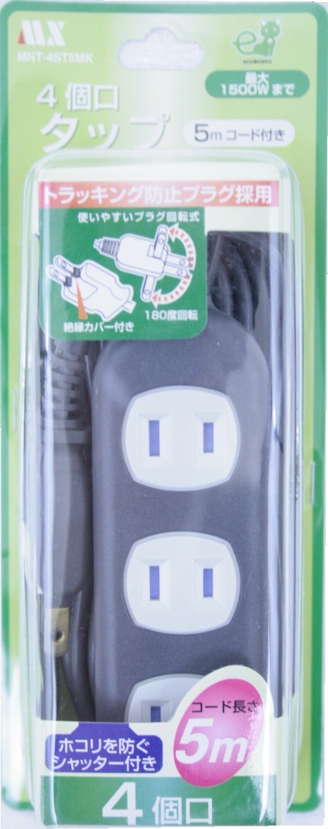 電源タップ [4個口] 延長コード 5m ブラック 1500W まで ムービープラグ 電源コード MNT-4ST5MK