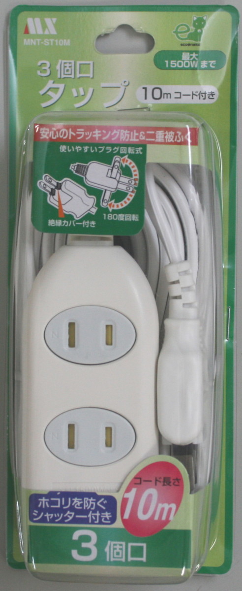 電源タップ [3個口] 延長コード 10m ホワイト 1500W まで ムービープラグ 電源コード MNT-ST10M