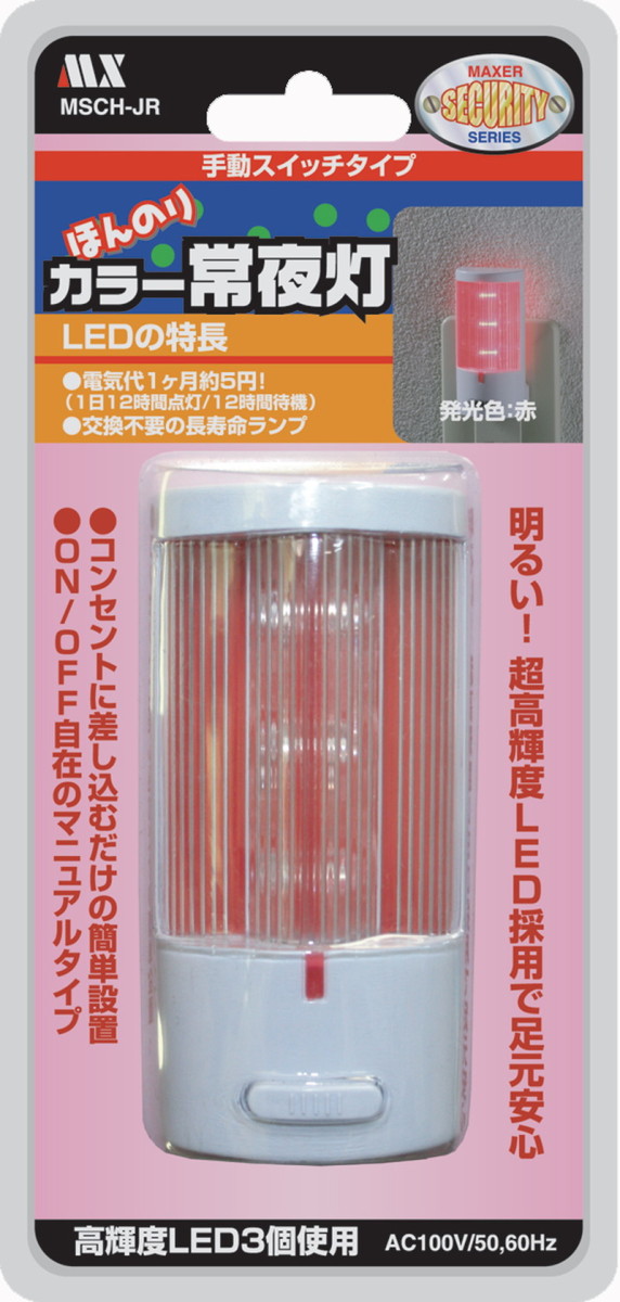 明るすぎない やわらかな光 ほんのり カラー常夜灯 スイッチタイプ レッド プッシュスイッチで確実にON/OFFできます。