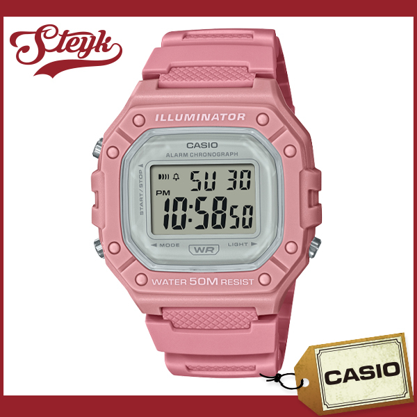 カシオW-218Hは、極太の7セグメントディスプレイで時刻を表示する、視認性の高い腕時計です。各セグメントが極太に設計されていることに加え、背景との明度差も極めて大きいため、時刻がくっきり明瞭に表示されます。G-SHOCKを想起させるデザインも特徴の一つで、かつて販売されていたDW-5300を彷彿とさせる形状をしています。ベルトもG-SHOCKのそれによく似たデザインですが、モザイクのような凹凸パターンが刻まれているところが、この腕時計ならではの持ち味です。