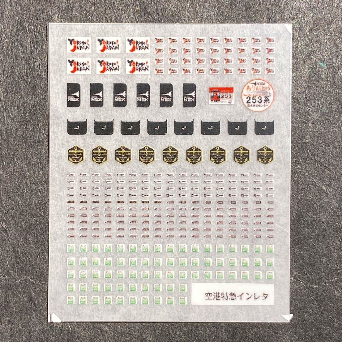 253系の末期に貼られたキャンペーンラッピングとE259系のマリンエクスプレス踊り子マーク、及びドア横に貼られつつあるWi-Fi標記を再現したNゲージ用インレタです。