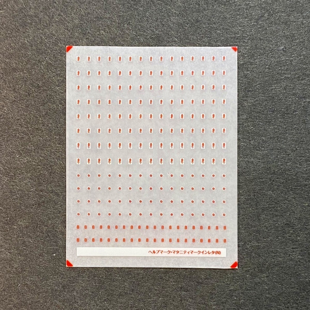 3色刷のインレタです。必ずノンアルコールのウェットティッシュ等を用いて表面の脂を落としてから転写し、裏紙をあててしっかり密着させ、クリアコーティングしてください。比較的薄手のインレタです。