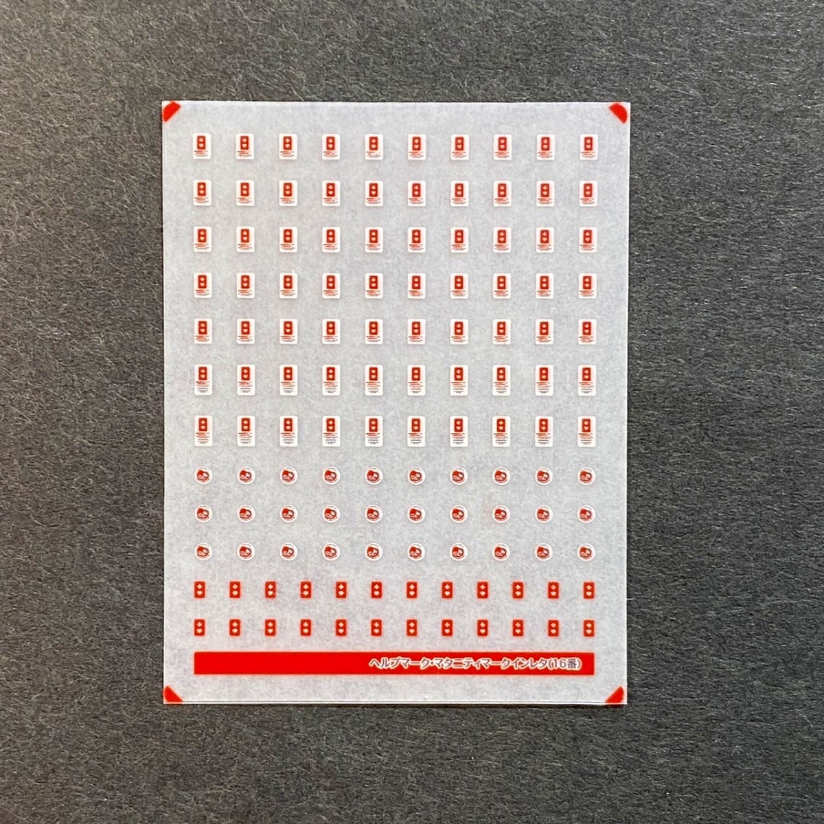 3色刷のインレタです。必ずノンアルコールのウェットティッシュ等を用いて表面の脂を落としてから転写し、裏紙をあててしっかり密着させ、クリアコーティングしてください。比較的薄手のインレタです。