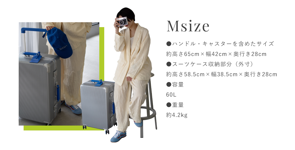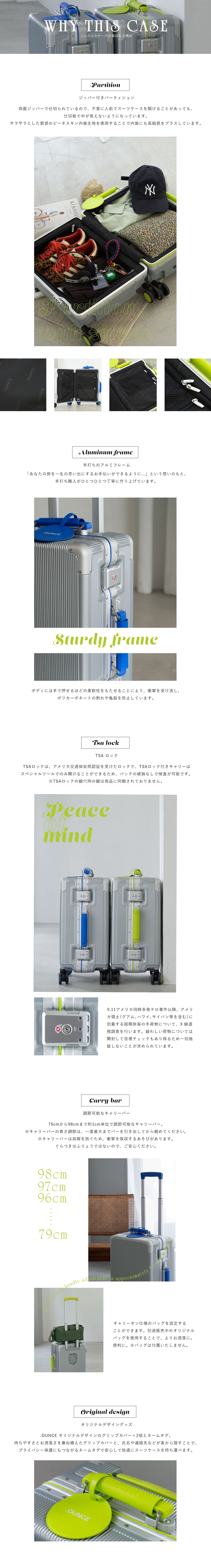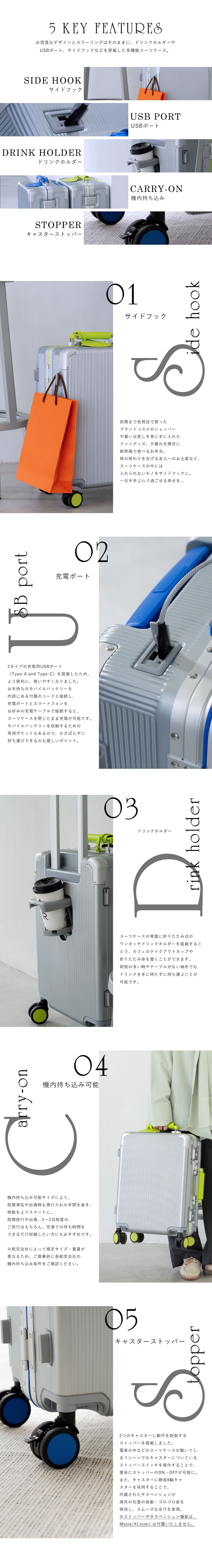 「あなたの旅を一生の思い出にするお手伝いができるように...」という想いのもと、手打ち職人がひとつひとつ手打ちでつくっています。純ABS樹脂より耐衝撃性、透明性に優れたABS樹脂とPC(ポリカーボネート)の混合素材を採用したボディとひとつひとつ丁寧に作り上げられたアルミフレームとアルミ製コーナーパッドは、美しさと快適さを併せ持ったワンランク上のスーツケースへと導いています。