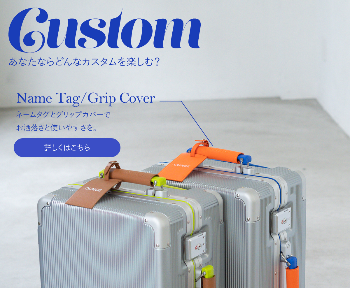 持ちやすさとお洒落さを兼ね備えたグリップカバーと氏名や連絡先を表から隠すことで、プライバシー保護にもつながるネームタグで、安心して快適にスーツケースを持ち運べます。両アイテムとも取り外しが容易に可能。