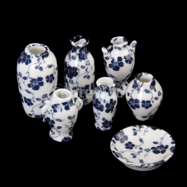 ミニチュア 美しい 花瓶 ドールハウス 現代陶芸 中国磁器の花瓶 ブルー 1/12 手作り ドールハウス 装飾的 7個