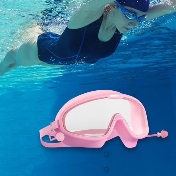 スイミングゴーグル スイムグラス ラージフレーム ダイビンググラス 耳栓付き ピンク クリア 袋入り