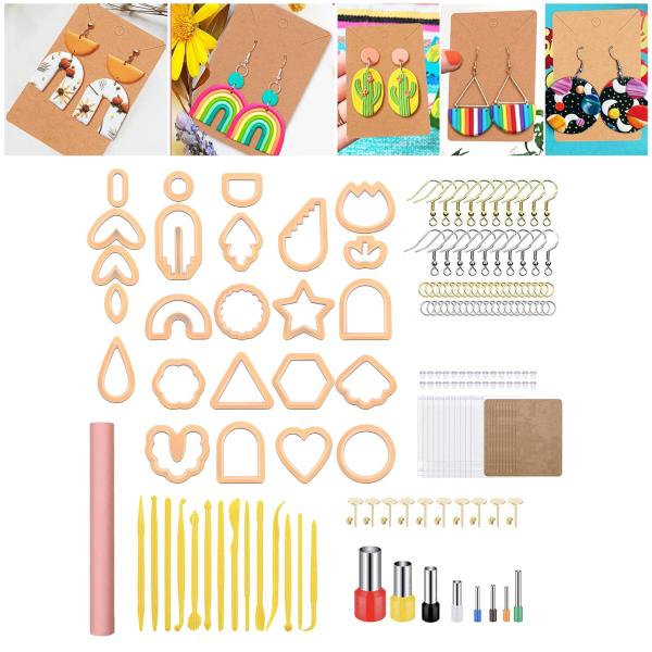 複数の形状とサイズ: パックには.24 の異なる形状のイヤリング カッター.10 セットのイヤリング カードとセルフ シーリング バッグ.10 セットのイヤリング スタッド.20 個のイヤリング フック.30 個のジャンプ リング.30 個のイヤリング バック.8 個の円形カッター キャスティング.1x クレイ ローラーが含まれます. .14個のミニカービングツール.