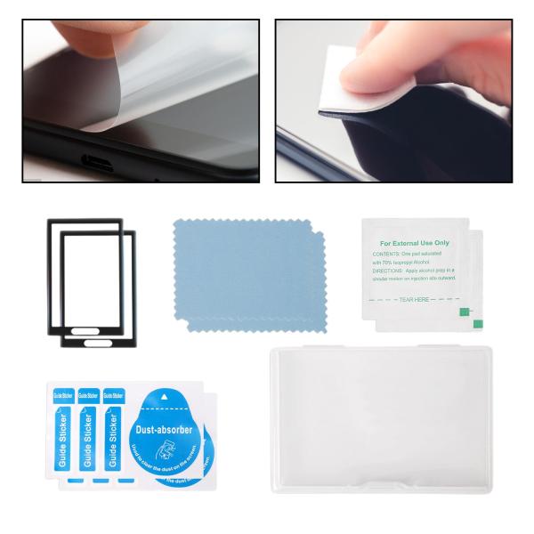 2 つの湾曲アクション カメラ強化フィルム キット (強化フィルム 2 枚.クリーニング バッグ 2 個.クリーニング クロス 2 枚.防塵ステッカー 2 枚.収納ボックス 1 個を含む)注意: