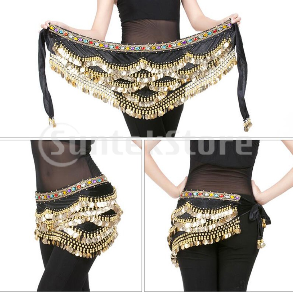 ベルベットダングリングゴールドコインベリーダンスヒップスカートスカーフラップベルトブラック