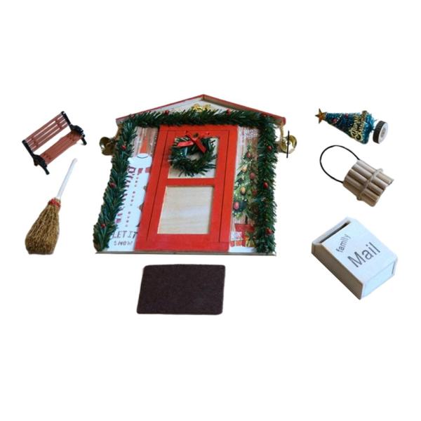 7個のクリスマスドールハウスキット.木製ドア.クリスマスツリー.バケツ.メールボックス.玄関マット.ほうき.ベンチのセット.