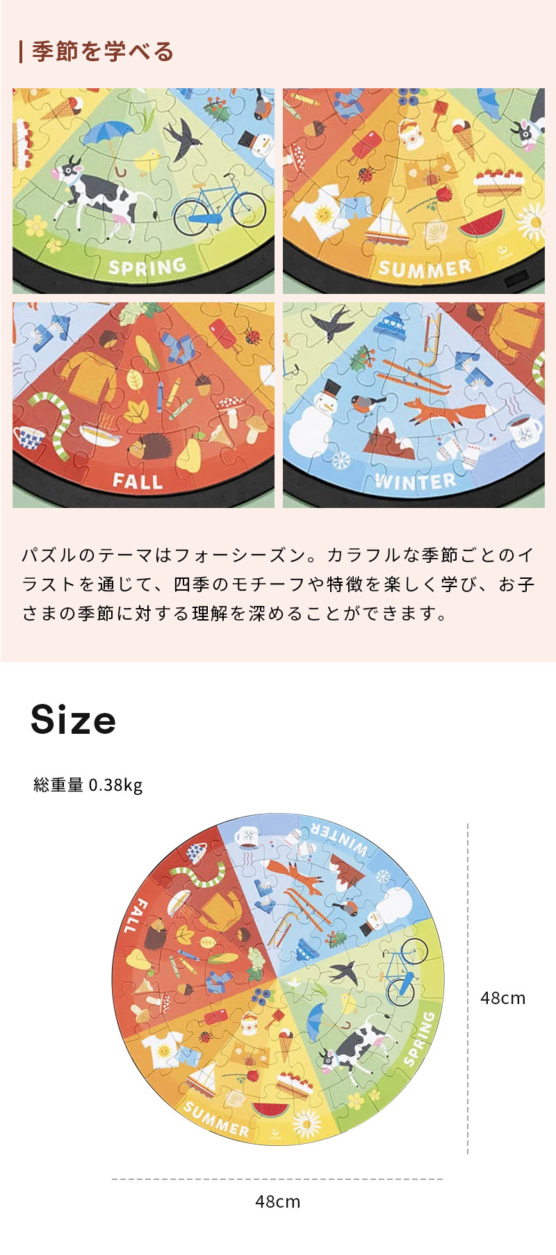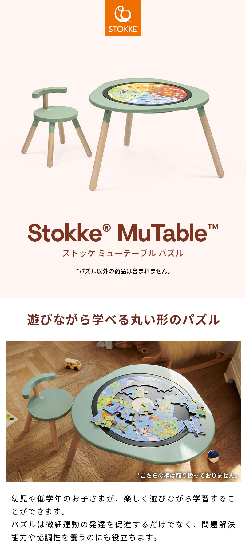 | 遊びながら学習できる丸い形のパズル【パズル フォーシーズン】 ストッケ ミューテーブル用にデザインされたパズルで、幼児や低学年のお子さまが、楽しく遊びながら学習することができます。 ご家庭や幼稚園・保育園等で定番のおもちゃであるパズルは、微細運動の発達を促進し、問題解決能力を養うのに役立ち、協調性も育みます。 お子さまは知らず知らずのうちに、色や形に関連する脳の認知機能や、計画的に学習する力を身につけます。 高品質の丈夫な素材でできたストッケのミューテーブルパズルはピースが大きく、小さな手でも持ちやすくなっています。 お子さまが夢中になって遊びながら学び、想像力を刺激するカラフルで楽しいおもちゃです。 何よりも、完成したときはお子さまが達成感を感じ、 「できた!」の瞬間に出る笑顔や喜びを、ともに分かち合うことができます。 パズルのテーマは「フォーシーズン」です。 ・ストッケミューテーブル プレイテーブル用デザイン ・目的に応じた楽しく教育的な遊び ・お子さまが季節について学ぶことができます ・見たものを記憶する遊びを通して記憶力を向上 ・微細運動の発達を促進・お子さまの手と目の協調の発達を促進 ・問題解決力と推理力を養成 ・自尊心を養成 ・友人や兄弟との遊びを通して協調性を養成・大きくて握りやすいカラフルなピース ・高品質で丈夫な素材: ・「フォーシーズン」パズル:紙 ・有害物質不使用 ・対象年齢:3才以上 |