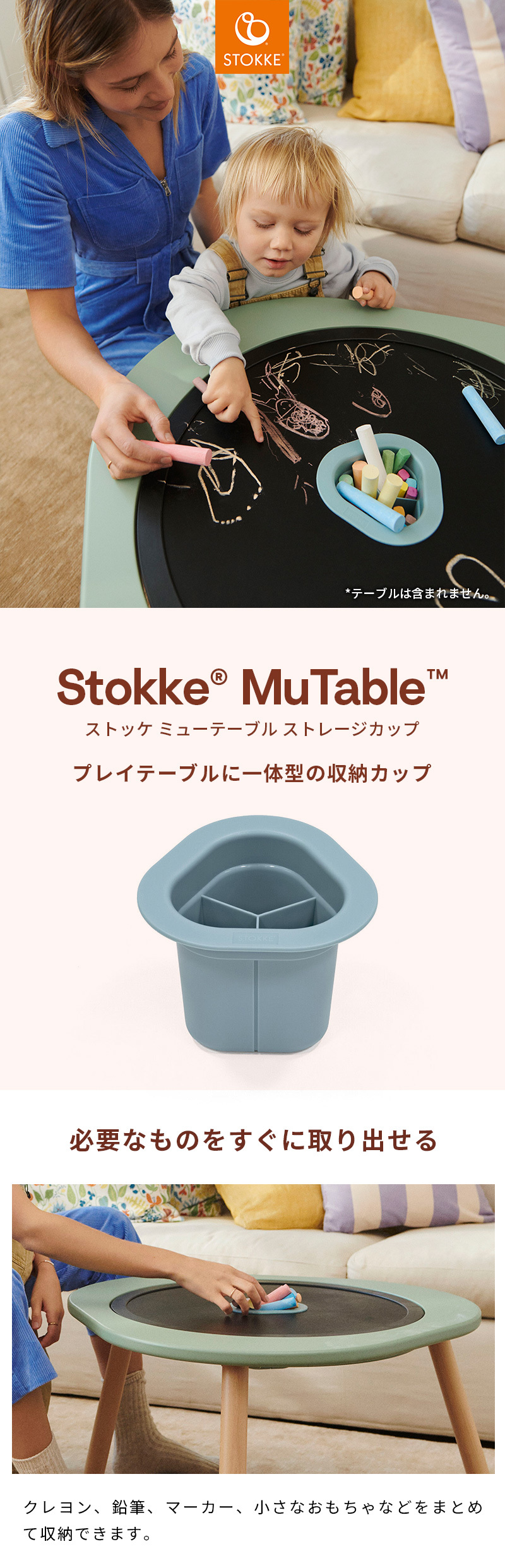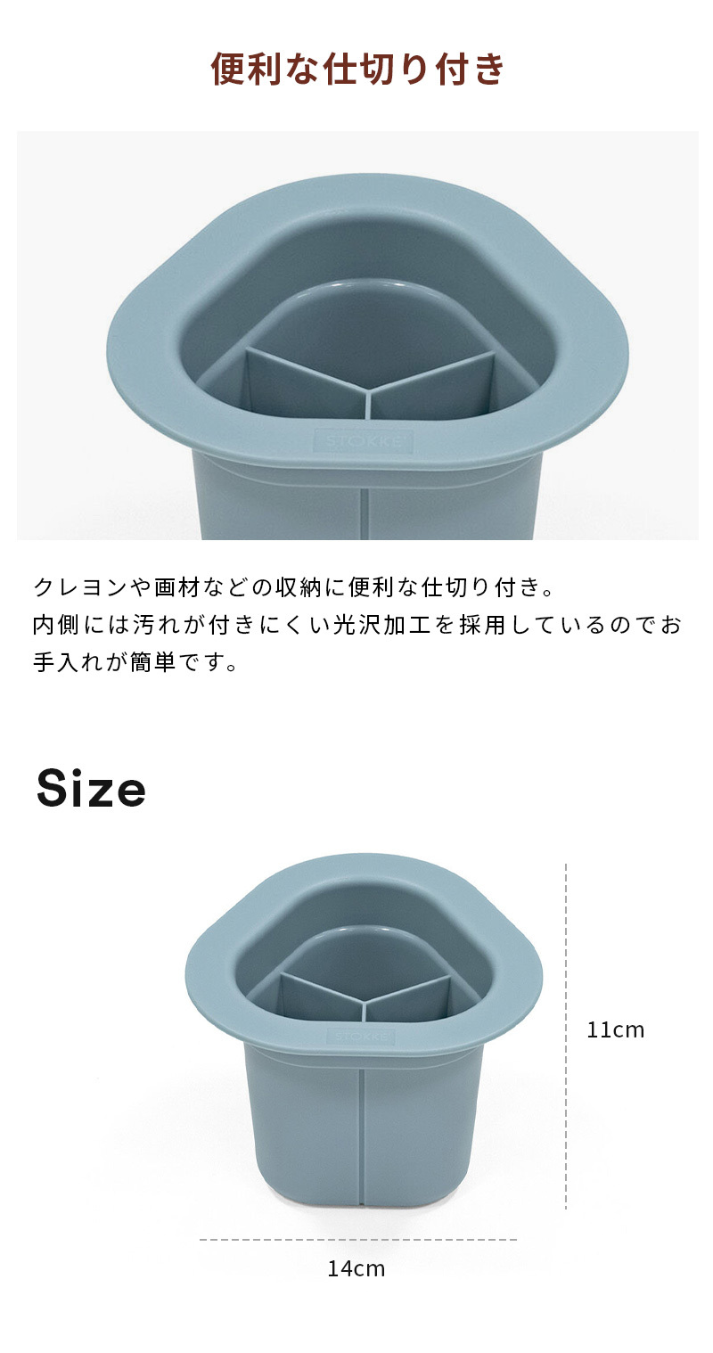 | お子様のプレイテーブルに最適な一体型収納カップ 【ストレージカップ】 整理整頓を学ぶのに、早すぎるということはありません。 いつでも手が届く場所に道具があれば、お子さまが作品づくりに必要なものをすぐに取り出せます。 ストッケ ミューテーブル ストレージカップをストッケ ミューテーブル プレイテーブルに取り付ければ、クレヨン、鉛筆、マーカー、小さなおもちゃなどをまとめて収納できます。 とても簡単!テーブルの真ん中に置けば、誰でも簡単に手が届きシェアすることできます。 早い時期からお子さまの協調性やチームワークを育みます。 遊び終わった後は、道具をカップに戻すだけなので、後片付けも簡単で楽しくできます。 ・ストッケミューテーブル プレイテーブル用デザイン ・テーブルの真ん中に配置して、一緒に遊んだり、シェアすることを学べます ・クレヨン、鉛筆、画材の収納に便利な仕切り付き ・遊んだ後のお掃除を簡単に楽しく ・どのテーブルカラーにもマッチする配色 ・そのまま自立させて、ペン立てとしても使用可能 ・内側には汚れが付きにくい光沢加工を採用 ・鋭利な部分がなく、お手入れが簡単 ・有害物質不使用 ・対象年齢:1才半以上 |